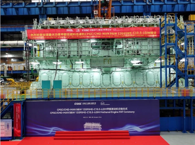 5月15日,中船集團(tuán)旗下中船動(dòng)力與MAN ES聯(lián)合舉辦的CPGC/CMD-MAN B&W 12G95ME-C10.5-LGIM-EGRTC甲醇發(fā)動(dòng)機(jī)工廠(chǎng)驗(yàn)收測(cè)試(FAT)交驗(yàn)儀式在中船動(dòng)力下屬中船三井成功舉行。
