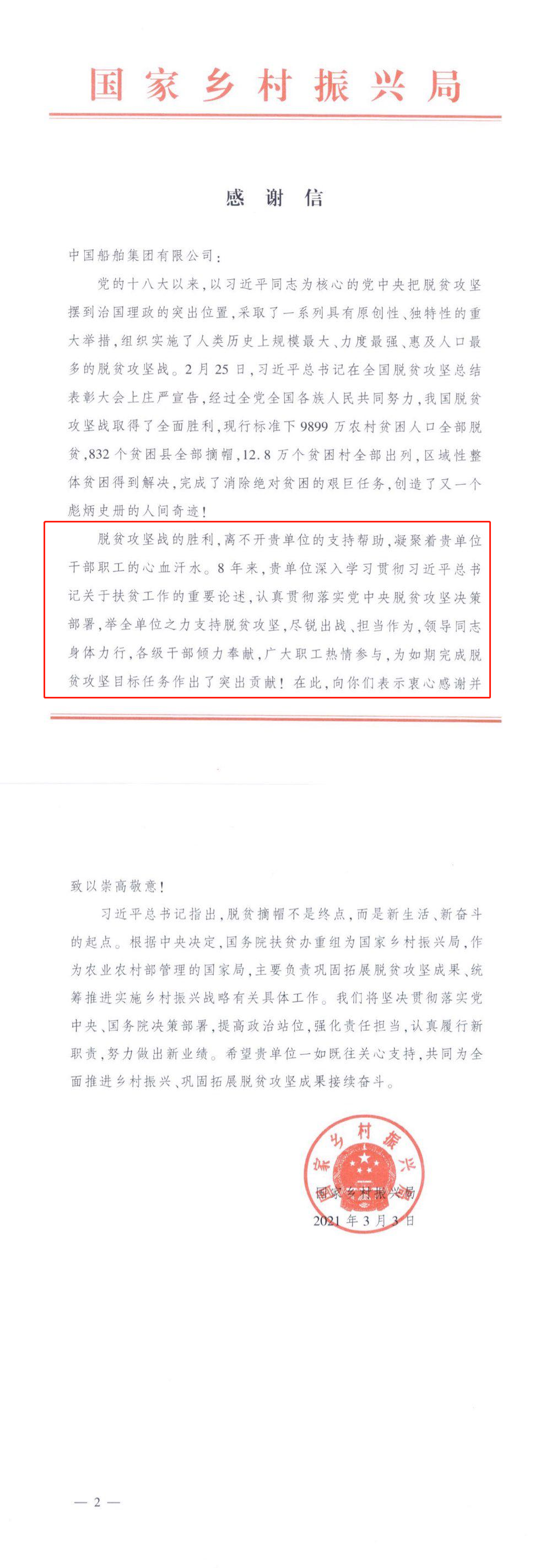 日前,中國(guó)船舶集團(tuán)收到一封特殊的感謝信。信中對(duì)中國(guó)船舶集團(tuán)8年來(lái)的擔(dān)當(dāng)作為、傾情奉獻(xiàn)表示感謝和敬意,這封信來(lái)自不久前剛剛掛牌的國(guó)家鄉(xiāng)村振興局。