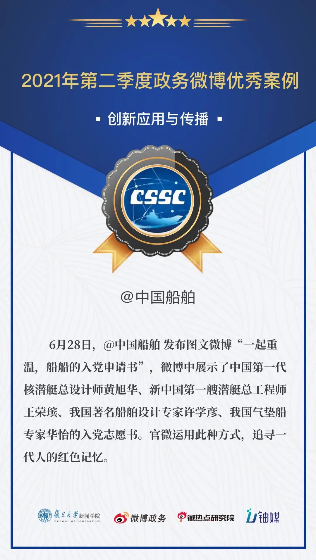2021第二季度政務(wù)微博優(yōu)秀案例新鮮出爐!其中,@中國船舶 和@國資小新 @中國航天科技集團(tuán) @最高人民檢察院 @中國警方在線 等18個政務(wù)微博一起,獲得2021年第二季度微博政務(wù)優(yōu)秀案例的“創(chuàng)新應(yīng)用與傳播”獎。