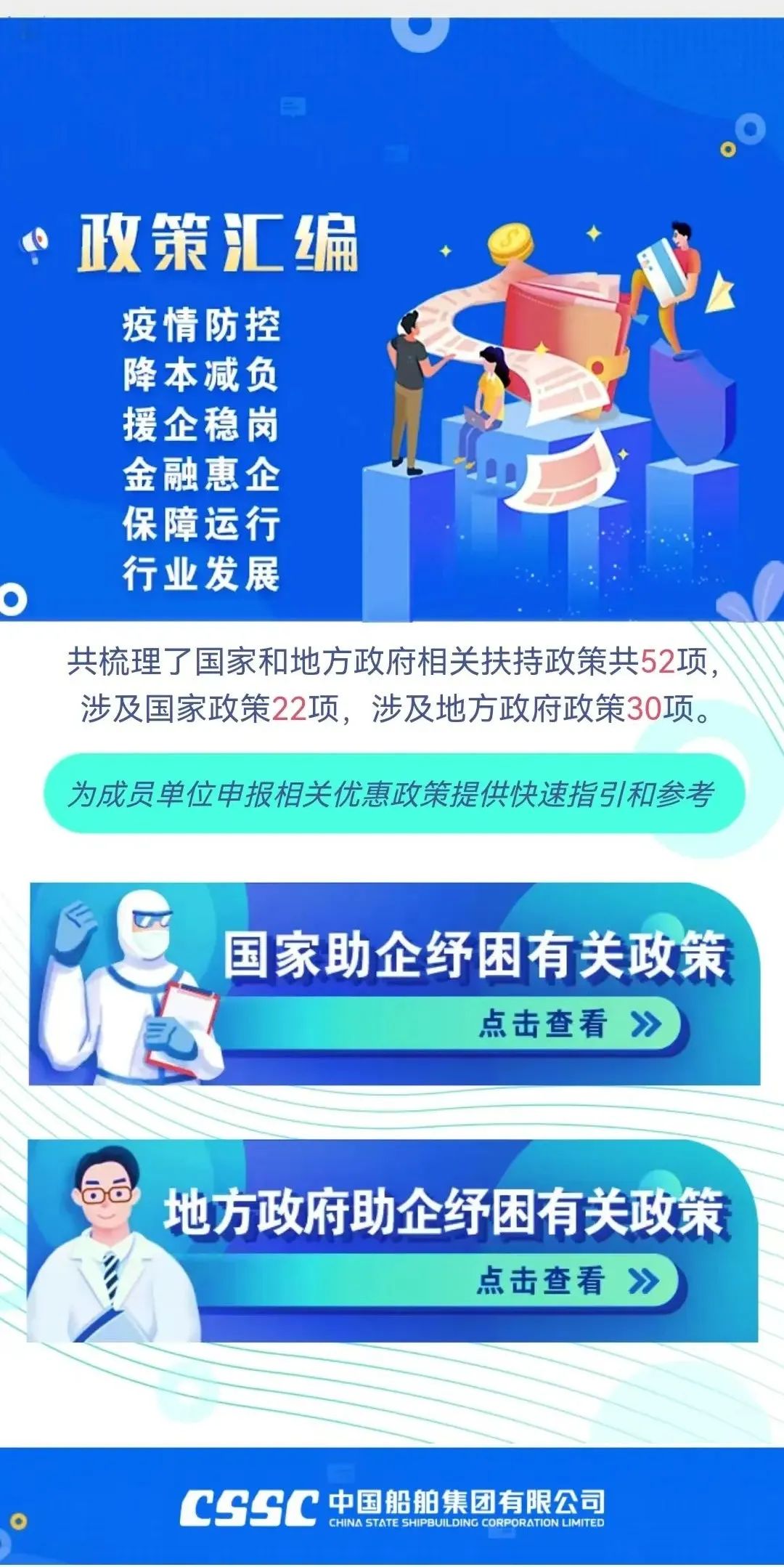 今年新冠疫情發生以來,為支持企業應對疫情防控、加快復工達產,國務院、相關部門、相關地方政府出臺了一系列助企紓困政策。集團公司對這些政策進行了梳理,共涉及相關支持政策52項(其中,國家支持政策22項地方支持政策30項),供成員單位查閱參考。