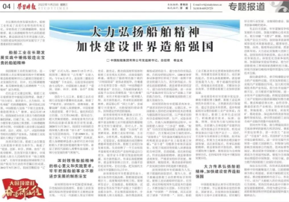 11月23日,中共中央黨校主辦的以思想理論宣傳為主旨的中央級大報《學習時報》刊發了中國船舶集團有限公司黨組副書記、總經理楊金成署名文章《大力弘揚船舶精神  加快建設世界造船強國》。