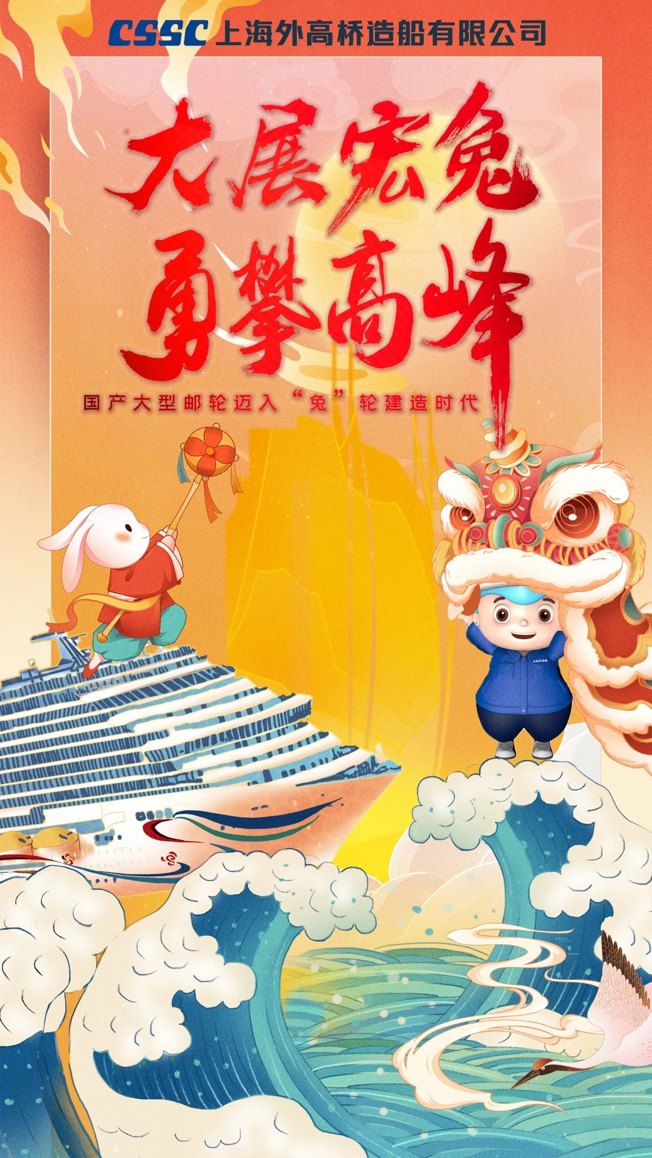 渤海造船的拜年海報以紅色背景為基礎,奠定喜慶祥和的節日氛圍,畫面主體采用中國傳統民間剪紙藝術,將飛騰的瑞兔與破浪的國之重器有機結合,讓我們2023年突飛猛進,大展宏圖!