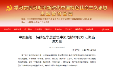 12月18日,學(xué)習(xí)貫徹習(xí)近平新時(shí)代中國(guó)特色社會(huì)主義思想主題教育官網(wǎng)發(fā)布《中國(guó)船舶:持續(xù)在學(xué)思踐悟中汲取精神偉力 匯聚奮進(jìn)力量》。中國(guó)船舶集團(tuán)通過繪好“施工圖”、念好“三字經(jīng)”、用好“五字訣”等扎實(shí)開展好主題教育,切實(shí)以主題教育成果推動(dòng)集團(tuán)公司加快建設(shè)世界一流船舶集團(tuán)。