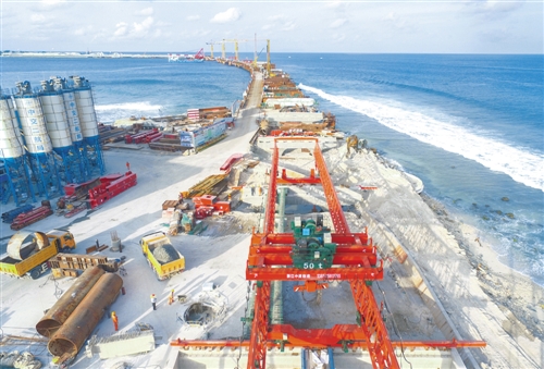 這是7月6日在馬爾代夫航拍的建設(shè)中的中馬友誼大橋。隨著主橋23號墩承臺最后一車混凝土的澆筑,中國援馬爾代夫中馬友誼大橋5個主橋承臺6日全部施工完成,標志著占全橋施工總量約70%的主橋部分從此徹底擺脫印度洋的強涌浪襲擾,進入上部結(jié)構(gòu)施工階段。