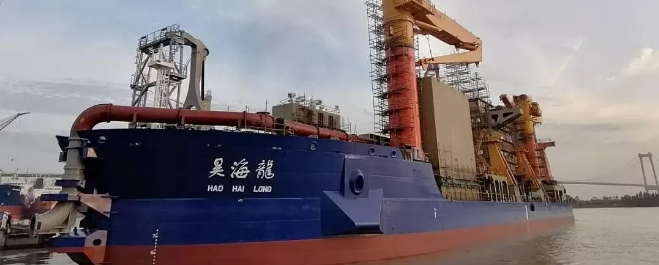 10月31日,黃埔文沖分別為美國Del Monte公司建造的600FEU全冷箱集裝箱船1號船和佛山市盈昊泰貿(mào)易有限公司建造的7800千瓦自航絞吸式挖泥船順利出塢。7800千瓦自航絞吸式挖泥船總長148米,最大挖深38米,配置了挖巖、挖黏土和挖沙等3種不同類型的絞刀,適用于挖掘淤泥、黏土、密實砂質(zhì)土、礫石、強風化巖以及抗壓強度在50兆帕以內(nèi)的中弱風化巖; 配備雙槳、雙轉(zhuǎn)動導流管、全電力驅(qū)動裝置,總裝機功率達25260千瓦,為亞洲最大功率自航絞吸式挖泥船,是我國新一代沿海水域、港口、航道疏浚、吹填的“神兵利器”。