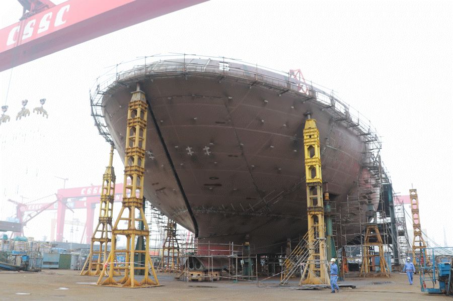 中國船舶集團(tuán)旗下廣船國際為中遠(yuǎn)海客建造的3000米車線貨滾船2號船在總組階段進(jìn)行開啟艏門作業(yè)。一座鋼鐵巨獸幼獸在液壓驅(qū)動下緩緩“張開大口”。這一工藝技術(shù)變革在全球尚屬首例。