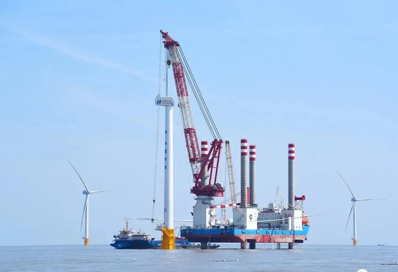 ????本次安裝難度大,30號風機單葉片長73.5米,旋轉直徑達158米,輪轂高度81米。塔筒共分為底、中、頂三段,風機整體總重量790噸以上,相當于500余輛小汽車的重量。“振江號”平臺安裝3臺1800千瓦電力推進全回轉舵槳,配備3臺750千瓦艏側推裝置。航速7節,續航能力達3000海里,定員100人,平臺最大作業水深50米,甲板作業面積約2500平方米,可容納3套6兆瓦級風機或2套8兆瓦級風機,并且可以獨立完成6兆瓦、8兆瓦級風機的安裝和其他水上工程施工的起重、打樁、吊裝和運輸等作業。