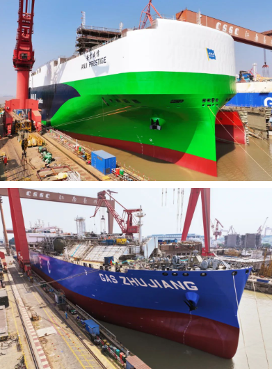 8月11日,中國船舶集團(tuán)旗下江南造船4號船塢迎來一艘99000立方米超大型乙烷乙烯運(yùn)輸船(VLEC)和一艘7800車位汽車運(yùn)輸船(PCTC)出塢 ,一艘99000立方米VLEC半船和一艘7800車位PCTC半船同步起浮,達(dá)成了“PV同步”建造模式的首批次出塢。