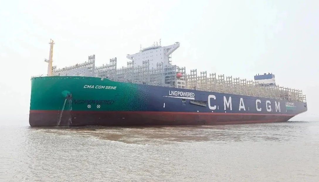 該船是法國達飛集團在滬東中華訂造的4艘24000TEU級雙燃料動力集裝箱船的首制船,也是滬東中華繼2020年9月完工交付的全球首創23000TEU雙燃料動力集裝箱船的升級優化型集裝箱船。該船總長399米,可一次裝下23872個集裝箱,包括2200個標準冷藏集裝箱,最大堆箱層數達24層,相當于22層樓高度,是新一代海上“綠巨人”和“帶貨王”。