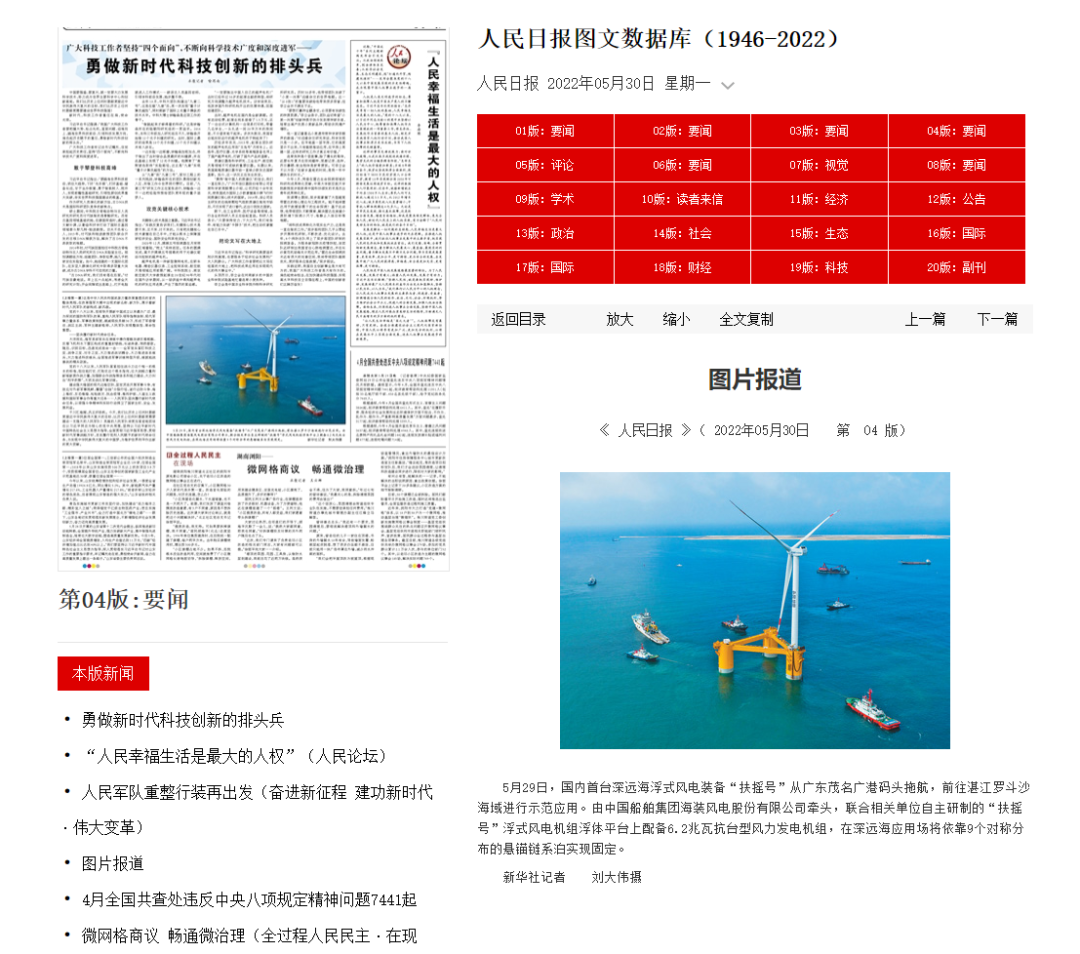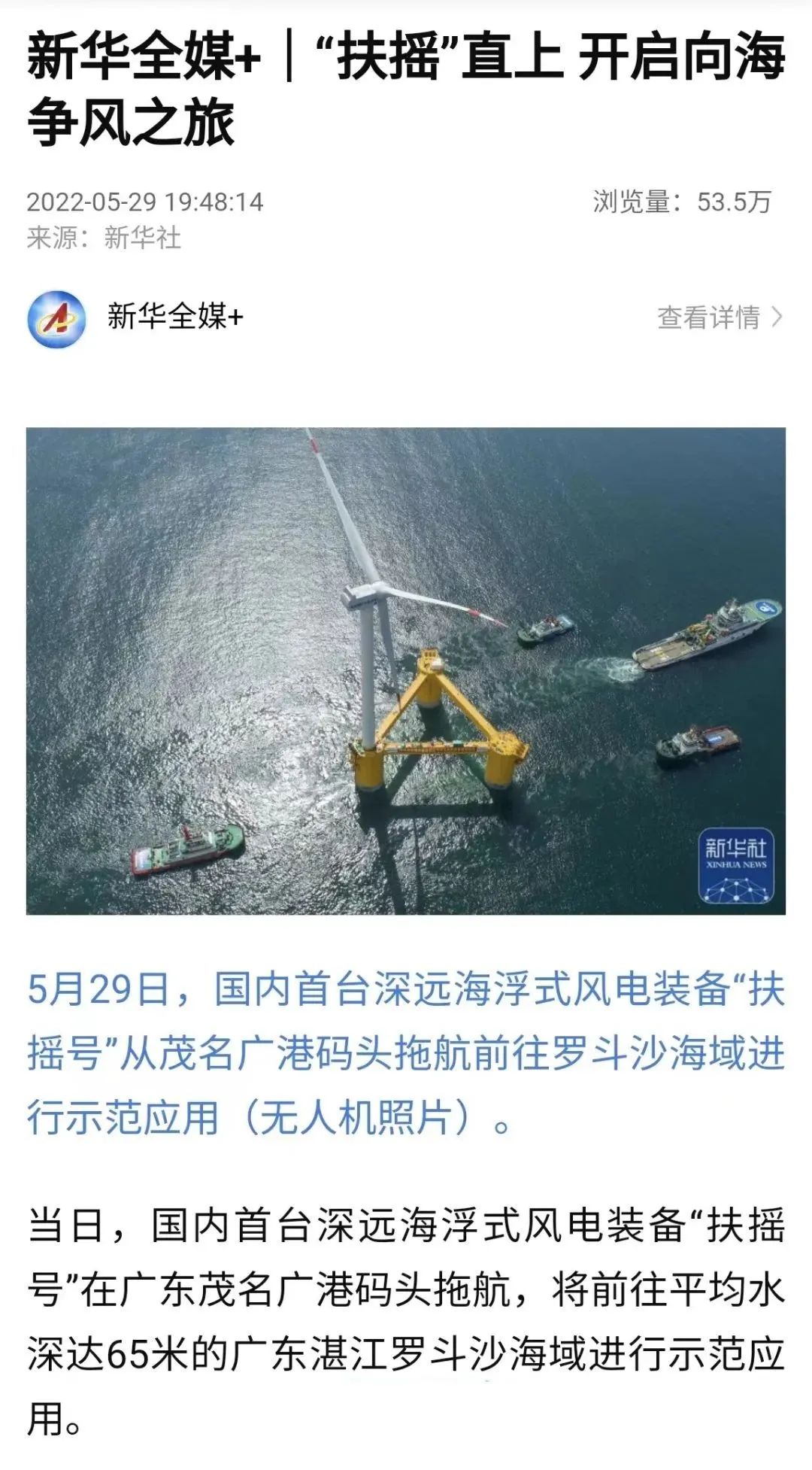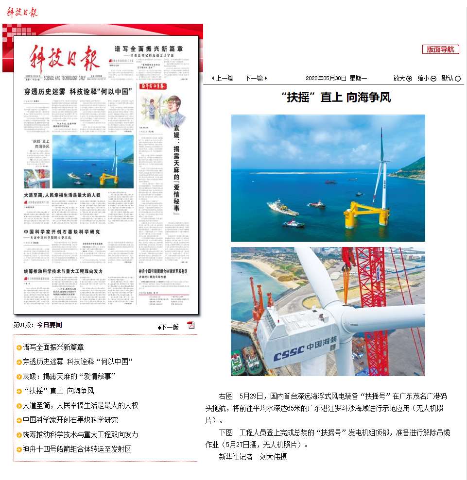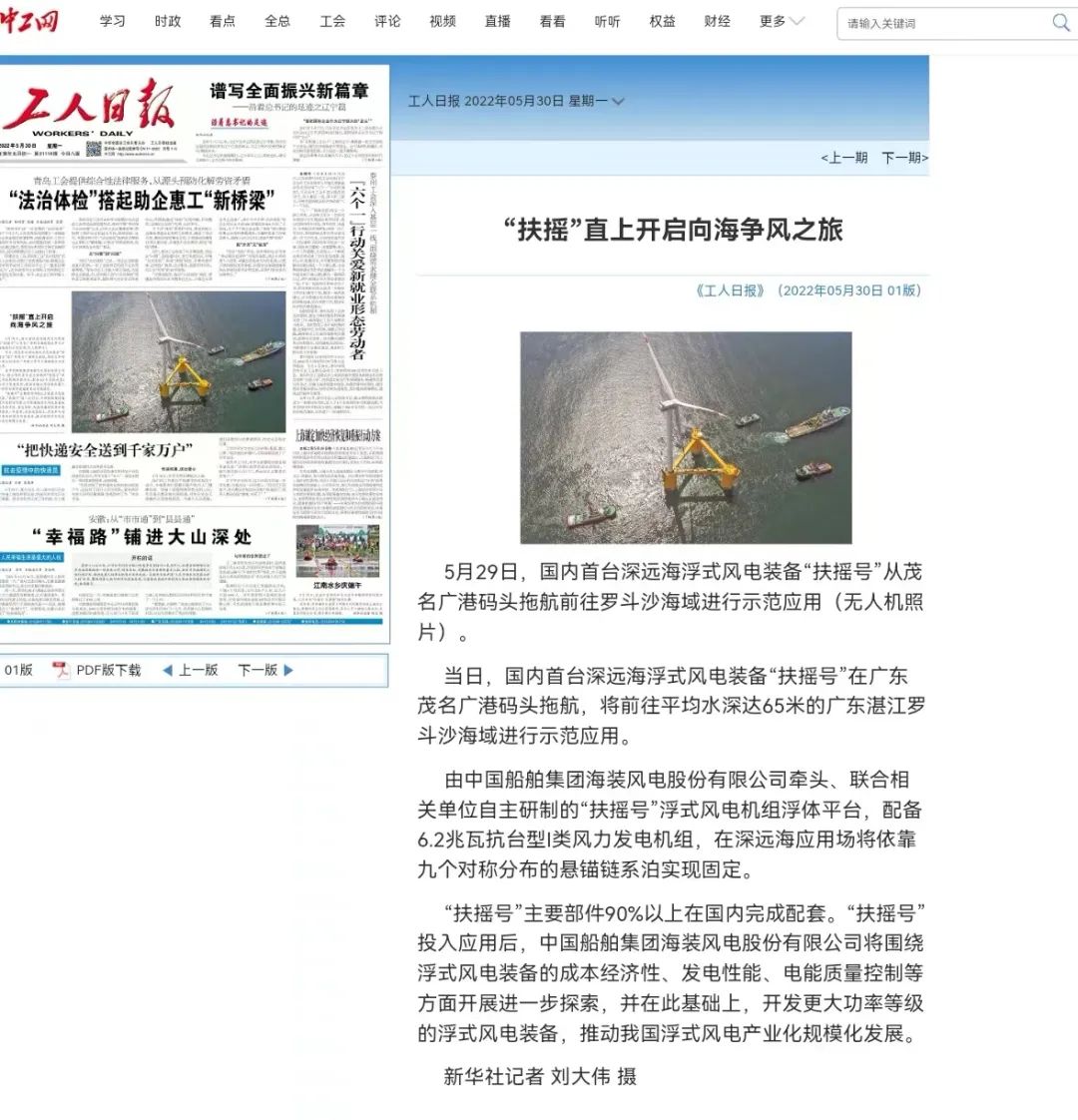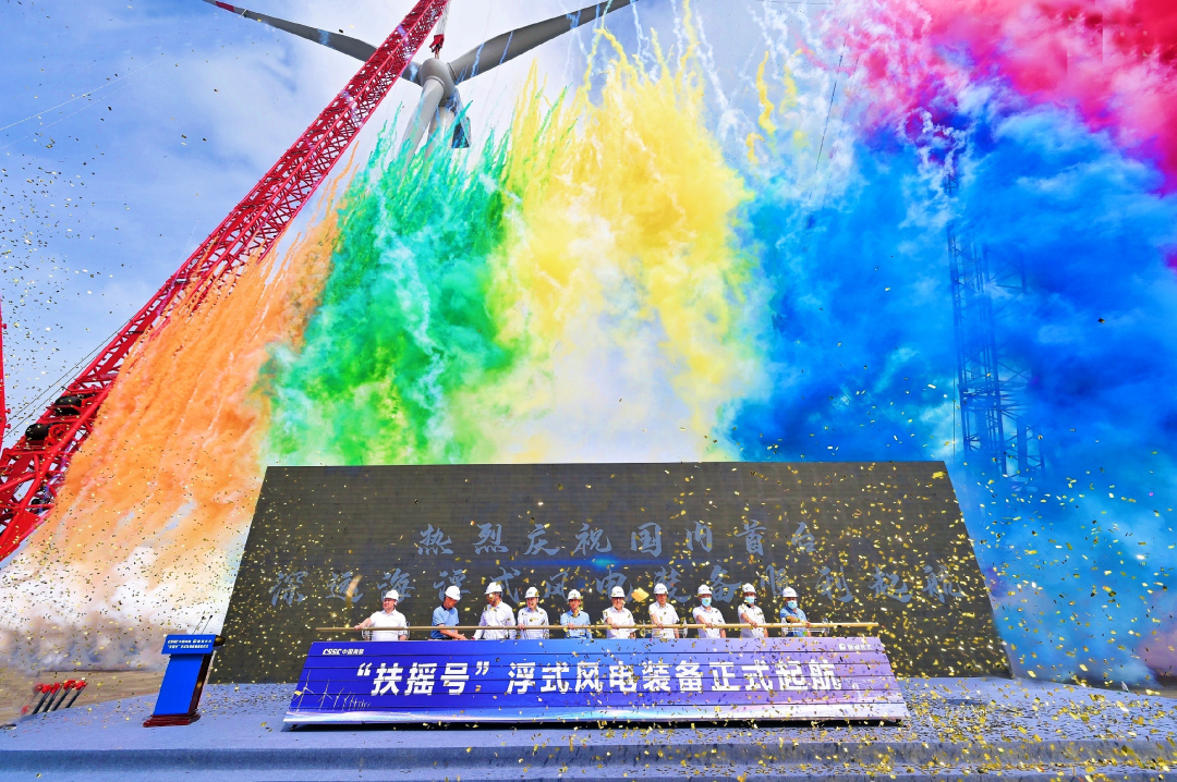 5月29日,中國船舶集團旗下中國海裝牽頭研制的國內首臺深遠海浮式風電裝備——“扶搖號”從廣東茂名碼頭起航,前往平均水深65米的廣東湛江附近海域投入示范應用。