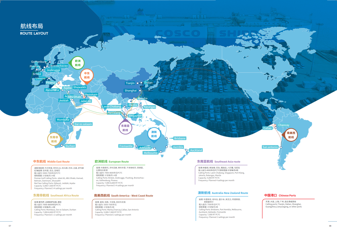 根據(jù)客戶需求,中遠海運協(xié)同船隊與港口優(yōu)化航線設(shè)置和運力配置,靈活調(diào)整全球航線布局,開通中東波斯灣、東南亞、歐洲、墨西哥、中南美洲、非洲等班輪航線,為客戶定制商品車運輸整體解決方案,提供多船型、全程端到端物流服務(wù)。