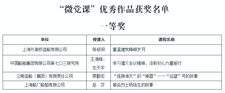 除一等獎的“微黨課”作品,其他獲評優(yōu)秀的“微黨課”和專題黨課可以登錄集團(tuán)公司黨校“中船e學(xué)”平臺首頁“中國船舶集團(tuán)有限公司黨課評選優(yōu)秀作品展示”進(jìn)行觀看。